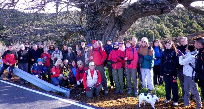 Los senderistas sexitanos no quisieron perderse una fotografía bajo un centenario y enorme alcornocal al poco de iniciar la ruta.