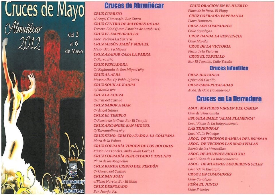 Desde el 3 al 6 de mayo se podrán visitar en Almuñécar una treintena de Cruces de Mayo. El fallo del Jurado será inapelable y se dará a conocer el 5 de mayo. A continuación se relacionan las Cruces participantes en el certamen: