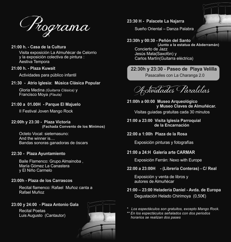 La Concejalía de Cultura del Ayuntamiento de Almuñécar espera y desea que los vecinos, visitantes y turistas, disfruten con esta serie de espectáculos como música, danza, exposiciones, visitas a museos,… en lugares emblemáticos del municipio y anima a que descubran los encantos de esta ciudad milenaria abierta y cosmopolita en esta noche cultural.