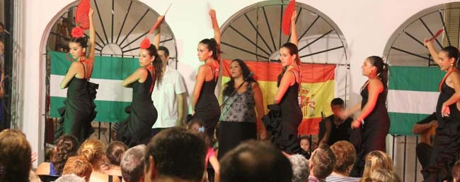El espectáculo de María Gómez «La Canastera» y su escuela de baile atrajo a numeroso público llenando de colorido y arte la plaza. María estuvo acompañada a la guitarra por «Niño Carmelo».