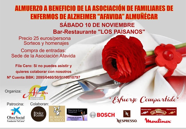 ALMUÑÉCAR. La Asociación de Familiares de Enfermos de Alzheimer de Almuñécar (AFAVIDA) organiza este sábado, día 10 de noviembre, un almuerzo solidario en el restaurante «El Paisano», situado en calle Manila, con el fin de recaudar fondos para la propia asociación ya que este año, «más que nunca» necesita del apoyo de todos ante los recortes que ya les ha obligado «a suspender el servicio de ayuda a domicilio».