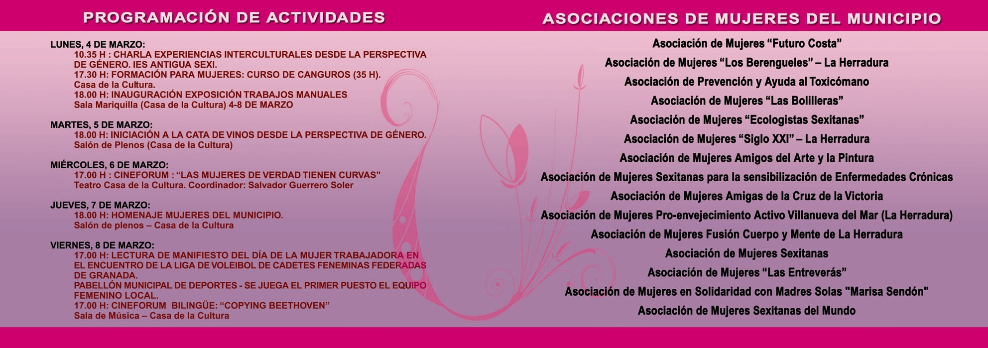 El programa del Día de la Mujer está organizado por la Concejalía de Bienestar Social e Igualdad contando con la colaboración las concejalías de Cultura y Deportes del Consistorio sexitano.