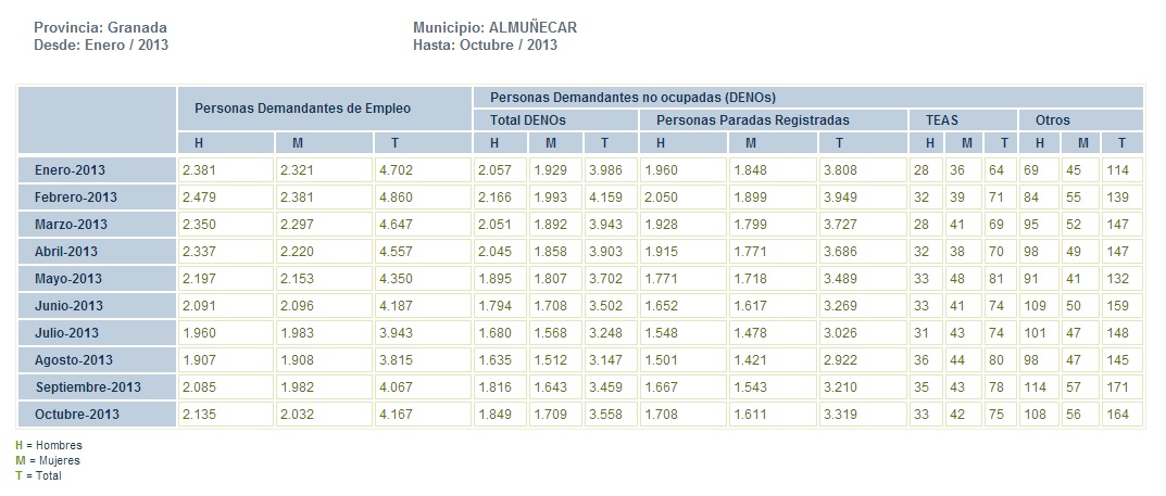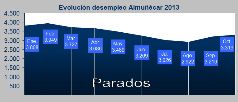 ALMUÑÉCAR. El número de parados en Almuñécar registrados en el mes de octubre, según datos publicados por el Observatorio Argos, dependiente de la Junta de Andalucía, fue de 3.319 desempleados, lo que supone un ascenso de 109 personas respecto al mes de septiembre de este mismo año, en el que el paró registrado se situó en 3.210 personas.