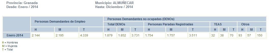 ALMUÑÉCAR. El número de parados en Almuñécar registrados en el mes de enero, según datos publicados por el Observatorio Argos, dependiente de la Junta de Andalucía, fue de 3.511 desempleados, lo que supone un ascenso de 162 personas respecto al mes de diciembre de 2013, en el que el paró registrado se situó en 3.349 personas. Respecto al mes de enero de 2013, en el que el paro registrado fue de 3.808 personas, el número de desempleados inscritos habría bajado en 297 personas.