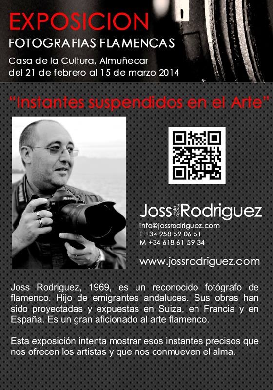 Joss Rodríguez es un conocido fotógrafo de flamenco. Hijo de emigrantes andaluces, sus obras han sido proyectadas y expuestas en Suiza, Francia y España. Es un gran aficionado al arte flamenco. En esta exposición intenta mostrar esos instantes precisos que nos ofrecen los artistas y que nos conmueven el alma.