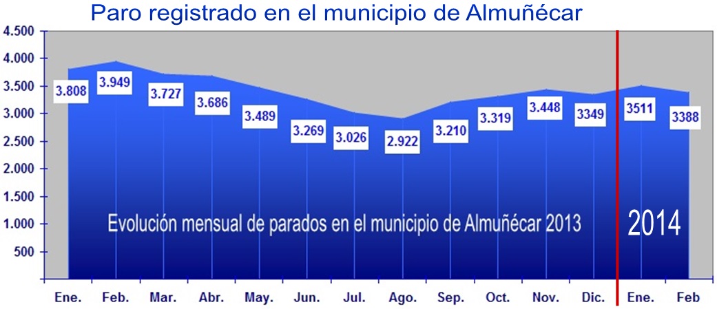 ALMUÑÉCAR. El número de parados en Almuñécar registrados en el mes de febrero, según datos publicados por el Observatorio Argos, dependiente de la Junta de Andalucía, fue de 3.388 desempleados, lo que supone un descenso de 123 personas respecto al mes de enero, en el que el paró registrado se situó en 3.511 personas. Respecto al mes de febrero de 2013, en el que el paro registrado fue de 3.949 personas, el número de desempleados inscritos habría bajado en 561 personas.