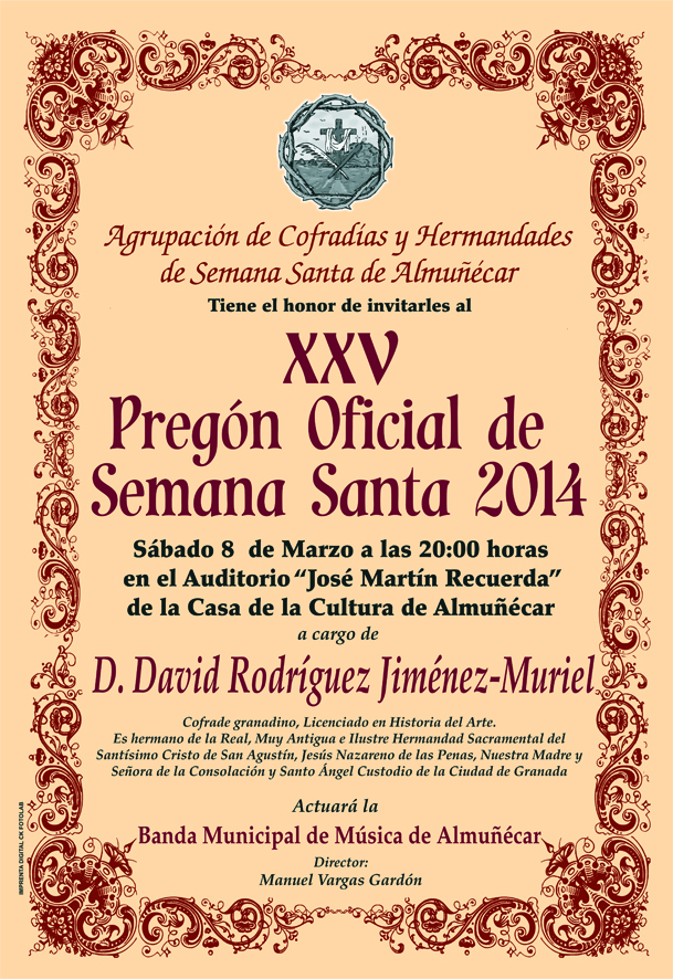 David Rodríguez Jiménez-Muriel, que se convertirá en el vigesimoquinto pregonero de la Semana Santa sexitana, es, además de cofrade, Licenciado en Historia del Arte, hermano de la Real, Muy Antigua e Ilustre Hermandad Sacramental del Santísimo Cristo, San Agustín, Jesús Nazareno de la Penas, Nuestra Madre y Señora de la Consolación y Santo Ángel Custodio de la Ciudad de Granada.