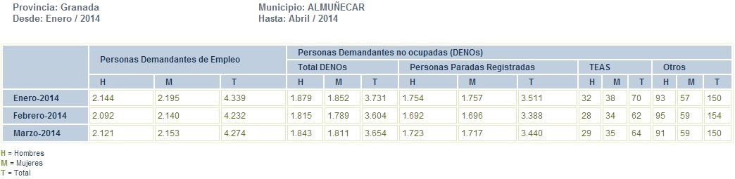 ALMUÑÉCAR. El número de parados en Almuñécar registrados en el mes de febrero, según datos publicados por el Observatorio Argos, dependiente de la Junta de Andalucía, fue de 3.440 desempleados, lo que supone un ascenso de 77 personas respecto al mes de febrero, en el que el paró registrado se situó en 3.388 personas. Respecto al mes de febrero de 2013, en el que el paro registrado fue de 3.727 personas, el número de desempleados inscritos habría bajado en 287 personas.