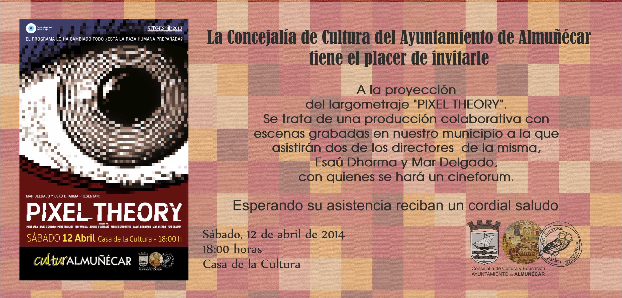 ALMUÑÉCAR. Este próximo sábado, día 12, a las 18:00 horas se proyectará en la Casa de la Cultura de Almuñécar el largometraje “Pixel Theory”, con escenas grabadas en el municipio sexitano y a la que asistirán dos de los directores de la misma como son Esaú Dharma (Jaén, 1980) y Mar Delgado (Granada, 1985), con quienes se llevará a cabo un cineforum.