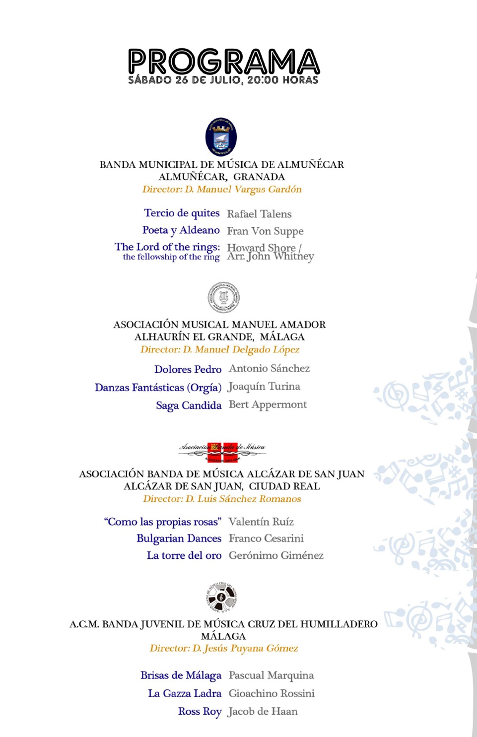 Volverán a formar parte del cartel de este año la Asociación Musical Manuel Amador de Alhaurín El Grande, la Banda Municipal de Música de Almuñécar y la propia Banda Juvenil Cruz del Humilladero.