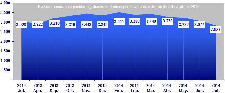 ALMUÑÉCAR. El número de parados en Almuñécar registrados en el mes de julio, según datos publicados por el Observatorio Argos, dependiente de la Junta de Andalucía, fue de 2.827 desempleados, lo que supone un descenso de 250 personas respecto al mes de junio, en el que el paró registrado se situó en 3.077 personas. Respecto al mes de julio de 2013, en el que el paro registrado fue de 3.026 personas, el número de desempleados inscritos habría bajado en 199 personas.