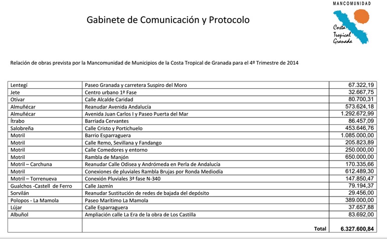 En este sentido, García Fuentes ha anunciado que la Mancomunidad costera va a invertir 6.327.600 euros en el último trimestre de 2014 en 19 obras, 15 que comenzarán en breve y otras 4 que están en ejecución y se reanudarán tras el verano como son la Avenida de Andalucía de Almuñécar, la Perla de Andalucía en Carchuna, la cortijada de Los Castilla en Albuñol y la conexión con el depósito en Sorvilán.