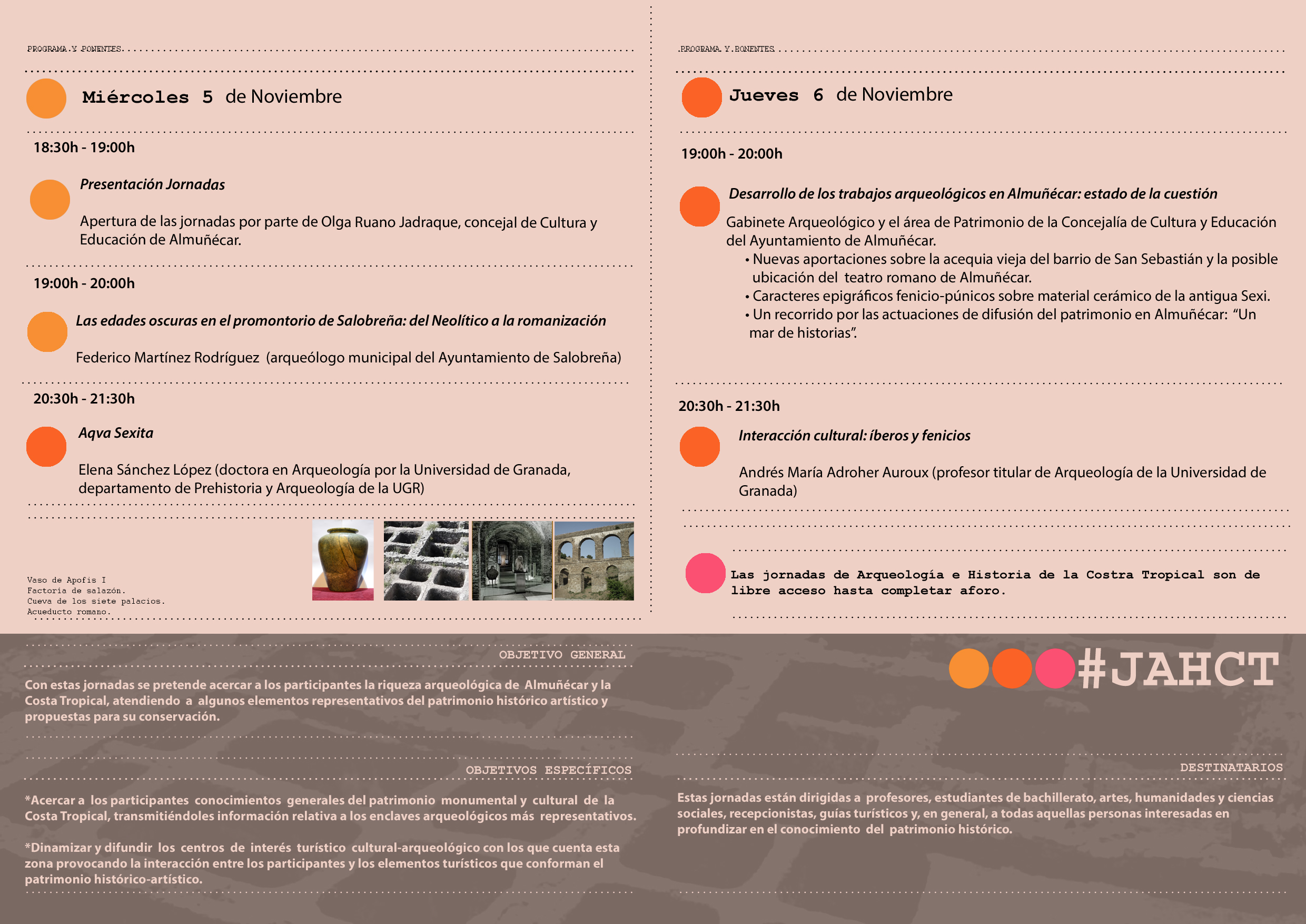 ALMUÑÉCAR. Desde 2011 se viene dando un gran impulso desde la Concejalía de Cultura y Educación del Ayto. de Almuñécar a la conservación y difusión del patrimonio cultural y arqueológico. Prueba de ello son las jornadas de divulgación que alcanza su 2ª edición. Lo que se pretende con estas jornadas es acercar a los participantes la riqueza arqueológica de Almuñécar y la Costa Tropical, así como los elementos más representativos del patrimonio histórico artístico y las propuestas para su conservación.