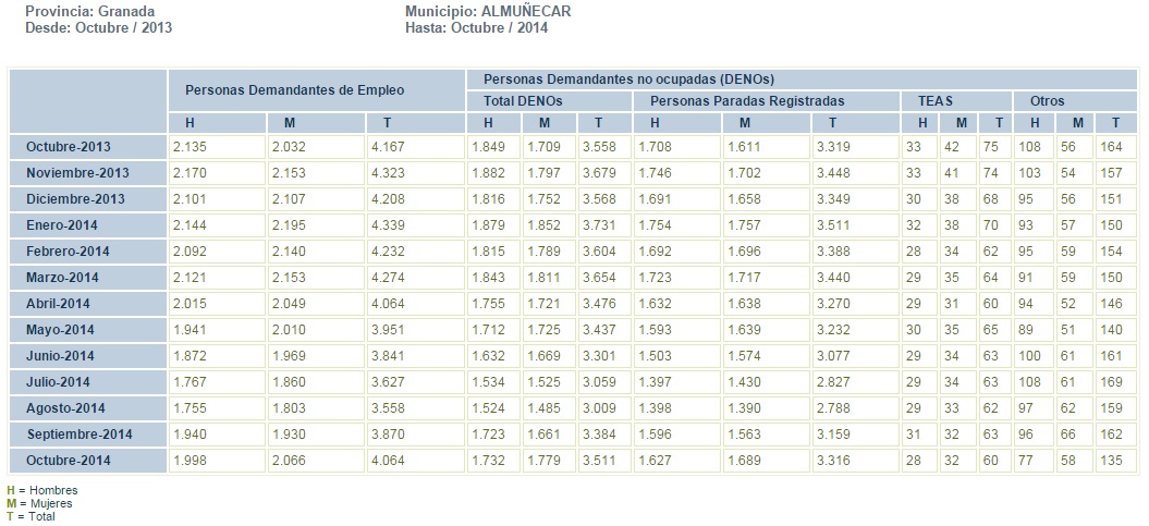 ALMUÑÉCAR. El número de parados registrados en octubre en el municipio de Almuñécar, según datos publicados por el Observatorio Argos, dependiente de la Junta de Andalucía, fue de 3.316 desempleados, lo que supone un incremento de 157 personas respecto al mes de septiembre, en el que el paro registrado se situó en 3.159 personas. Respecto al mes de octubre de 2013, en el que el paro registrado fue de 3.319 personas, el número de desempleados inscritos interanual habría bajado en tan solo 3 personas.