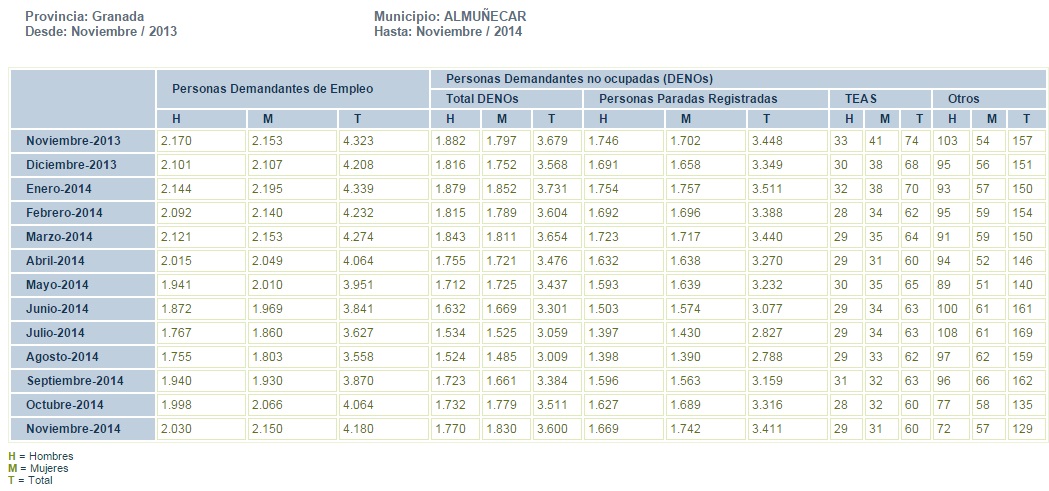 ALMUÑÉCAR. El número de parados registrados en noviembre en el municipio de Almuñécar, según datos publicados por el Observatorio Argos, dependiente de la Junta de Andalucía, fue de 3.411 desempleados, lo que supone un incremento de 95 personas respecto al mes de octubre, en el que el paro registrado se situó en 3.316 personas. Respecto al mes de noviembre de 2013, en el que el paro registrado fue de 3.448 personas, el número de desempleados inscritos interanual habría bajado en 37 personas.