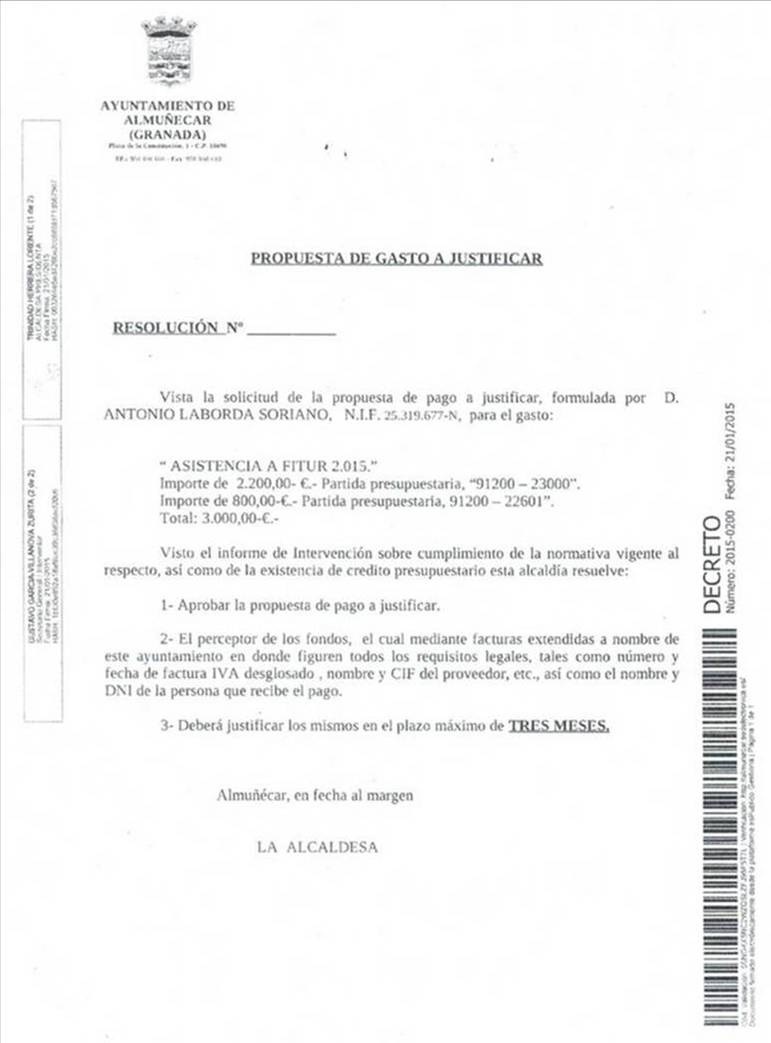 Con fecha 21 de enero de 2015, la Sra. Herrera firmó una resolución librándole a Antonio Laborda Soriano, concejal delegado de Hacienda y Personal del Ayuntamiento de Almuñécar, 3.000 euros para gastos en Fitur 2015.