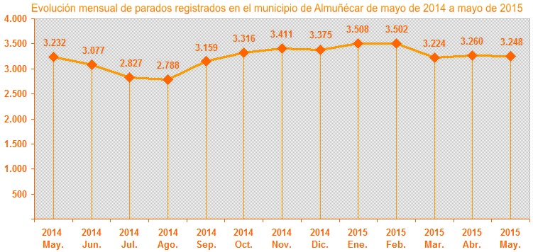 ALMUÑÉCAR. El número de desempleados registrados en mayo en el municipio de Almuñécar, según datos publicados por el Observatorio Argos, dependiente de la Junta de Andalucía, fue de 3.248 parados, lo que supone un descenso de 12 personas respecto al mes de abril de 2015, en el que el paro registrado se situó en 3.260 personas. Respecto al mes de mayo de 2014, en el que el paro registrado fue de 3.232 personas, el número de desempleados inscritos interanual habría aumentado en 16 personas.