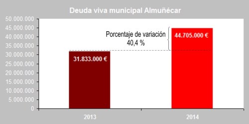 Lo anterior contrasta con la información hecha pública, vía nota de prensa del Ayuntamiento de Almuñécar de 7 de julio, en la que se decía que la administración local <<continuará con las medidas emprendidas hace cuatro años, en materia de hacienda local, tendentes a alcanzar los resultados óptimos de un “plan de ajuste” adaptado a la realidad municipal, que permita por un lado racionalizar al máximo el gasto público pero al mismo tiempo manteniendo la eficacia y optimización de todos los servicios que presta el consistorio y las inversiones municipales>>. Además, en dicha nota de prensa se dice: <<El equipo de gobierno que preside Trinidad Herrera Lorente consiguió culminar el pasado mandato municipal con una importante reducción de la deuda municipal, que al comienzo de dicho periodo superaba los 42 millones de euros y que hoy, en términos de deuda real viva, se sitúa en algo más de 35, lo que contrasta claramente con cualquier otro dato que se pueda haber hecho público en los últimos días y del que se hayan extraído conclusiones precipitadas y no ajustadas a la realidad>>. Esto último en «respuesta» a una información de Europatropical, publicada el 6 de julio, basada en datos del Ministerio de Hacienda y AAPP, que indican que la deuda financiera del Ayuntamiento de Almuñécar se disparó más de un 40% el último año, 2014, es decir, año pre-electoral.