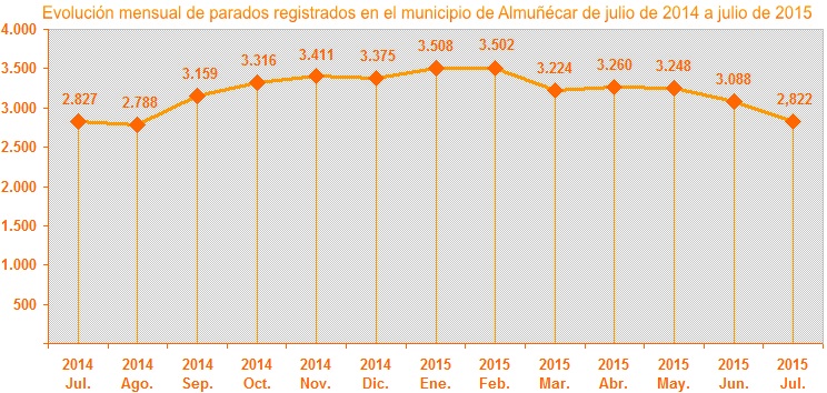El número de desempleados registrados en julio en el municipio de Almuñécar, según datos publicados por el Observatorio Argos, dependiente de la Junta de Andalucía, fue de 2.822 parados, lo que supone un descenso de 266 personas respecto al mes de junio de 2015, en el que el paro registrado se situó en 3.088 personas. Respecto al mes de julio de 2014, en el que el paro registrado fue de 2.827 personas, el número de desempleados inscritos interanual habría bajado en 5 personas.