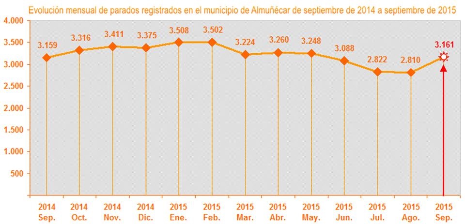 El número de desempleados registrados en septiembre en el municipio de Almuñécar, según datos publicados por el Observatorio Argos, dependiente de la Junta de Andalucía, fue de 3.161 parados, lo que supone un aumento de 351 personas respecto al mes de agosto de 2015, en el que el paro registrado se situó en 2.810 personas. Respecto al mes de septiembre de 2014, en el que el paro registrado fue de 3.159 personas, el número de desempleados inscritos interanual habría subido en 2 personas.