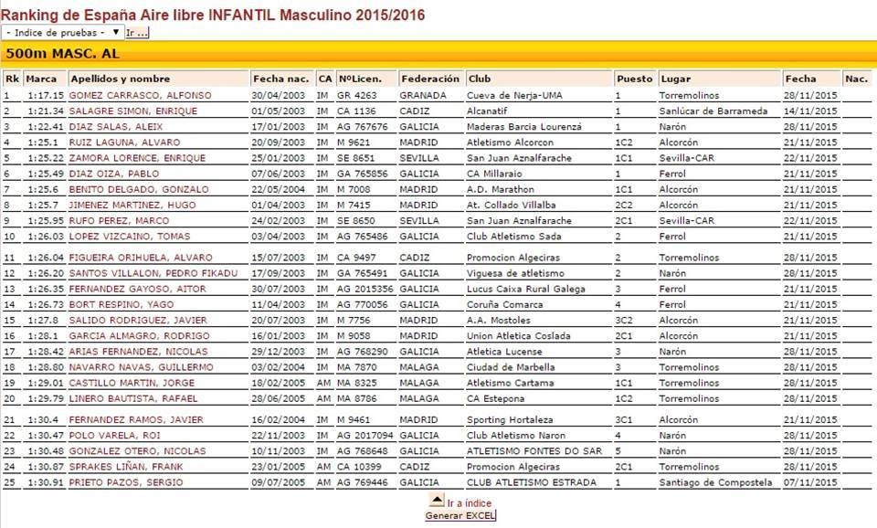 Este fin de semana compitió en Torremolinos y paró el crono en 1:17.15, una gran marca que explica por qué Alfonso Gómez Carrasco es el número 1 en el ‘Ranking de España Aire Libre Infantil MASCULINO 2015/2016’.