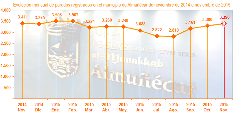 ALMUÑÉCAR. El número de desempleados registrados en noviembre en el municipio de Almuñécar, según datos publicados por el Observatorio Argos, dependiente de laJunta de Andalucía, fue de 3.390 parados, lo que supone un aumento de 90 personas respecto al mes de octubre de 2015, en el que el paro registrado se situó en 3.300 personas. Respecto al mes de noviembre de 2014, en el que el paro registrado fue de 3.411 personas, el número de desempleados inscritos interanual habría bajado en 21 personas.