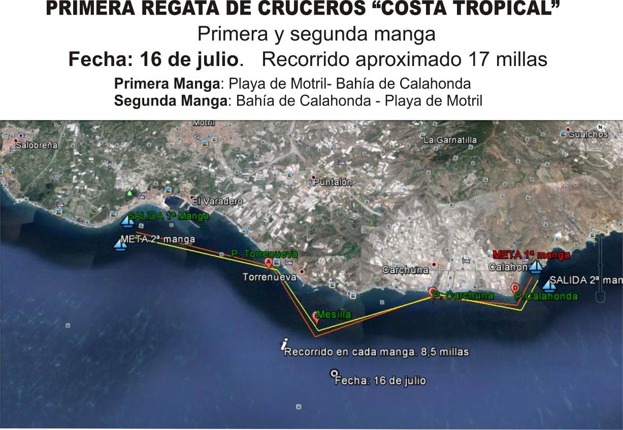 - PRIMERA PRUEBA: La flota saldrá de las inmediaciones de la Playa de Poniente de Motril, se dirigirá hacia Levante con el objetivo de montar la baliza Nº 1 por estribor en la Iglesia de TORRENUEVA, montar el Chispito de Torrenueva por babor como baliza Nº2, para dirigirse hacia la baliza Nº 3 el Camping de la Playa de Carchuna/Calahonda por estribor y la llegada en la Bahía de CALAHONDA.