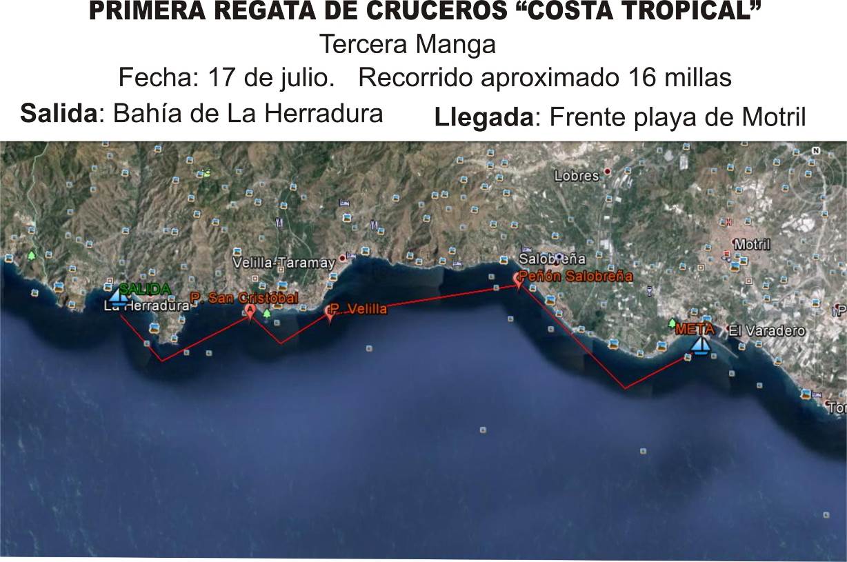 - TERCERA PRUEBA: La salida estará colocada en la Bahía de LA HERRADURA (36º 43´47.67´´N 3º 45´04.90´´ O), se dirigirá hacia la baliza Nº 1 en la Playa de San Cristóbal de ALMUÑÉCAR (36º43´39.98´´N 3º42´13.80´´O) que se montará por estribor, para luego tomar la boya Nº 2 en el Peñón de SALOBREÑA (36º44´00.05´´N 3º35´52.99´´O) también por Estribor y la llegada en la Playa de Poniente de MOTRIL.