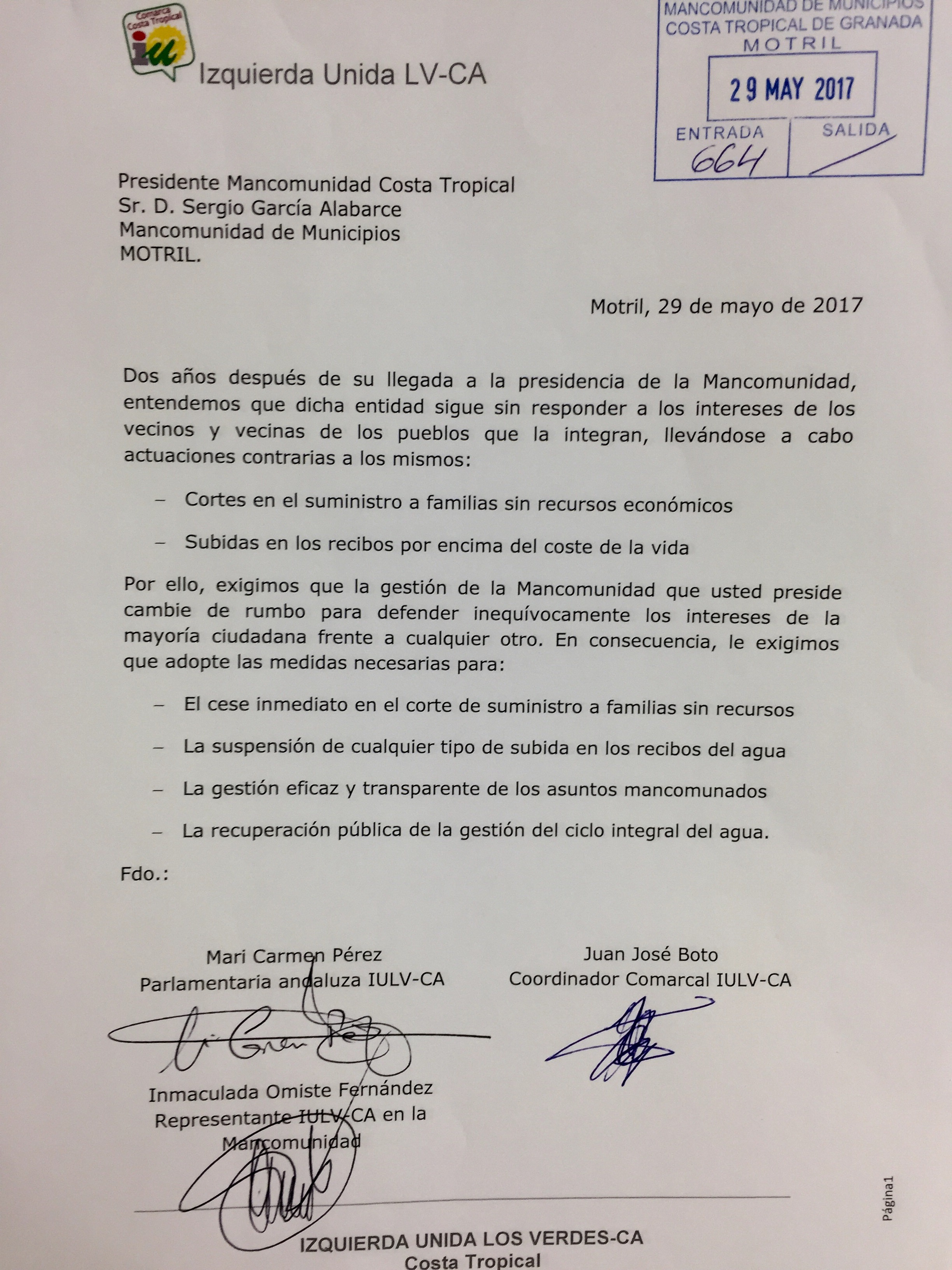 El escrito ha sido registrado por diversos representantes de Izquierda Unida, entre ellos Mari Carmen Pérez, parlamentaria andaluza, Juan José Boto, coordinador comarcal, e Inmaculada Omiste, concejala de IU Motril, y representante de su formación en la Junta General de la Mancomunidad, esta mañana en la sede de la Mancomunidad en Motril.