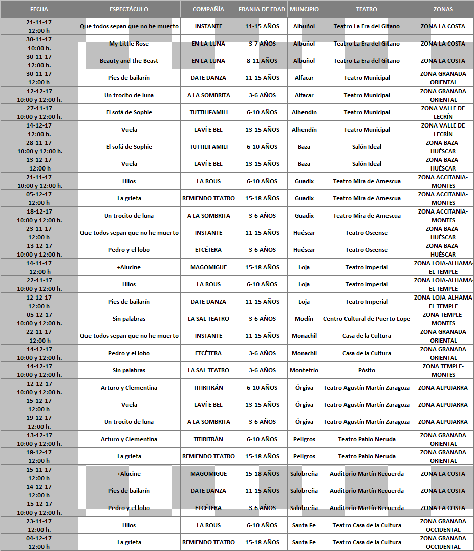 El ciclo de artes escénicas para público infantil y juvenil »Escenia Granada’ acercará el teatro y las artes escénicas a más de 10.000 escolares, a través de 14 municipios distribuidos por las diferentes comarcas de la provincia. El programa consta de un total de 12 espectáculos, con variedad de géneros escénicos, y una programación establecida por franjas de edad y en un soporte artístico proporcionado por compañías de teatro y otras artes escénicas predominantemente granadinas.