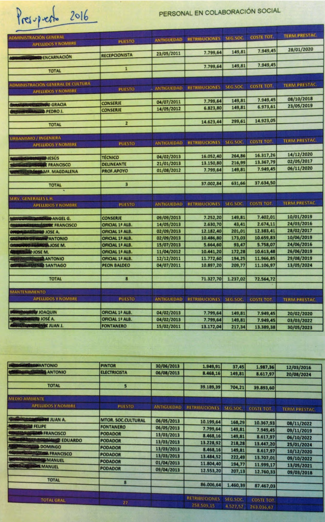 «Según el documento que adjuntamos, donde se relaciona la plantilla de los trabajadores de colaboración social del Ayuntamiento, la totalidad de las prórrogas de los contratos realizados en fraude de ley fueron realizadas por Trinidad Herrera», informan los andalucistas.