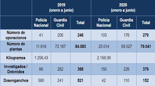 Una dedicación que, según Inmaculada López Calahorro, ha dado como resultado el desarrollo de un total de 279 operaciones vinculadas con el cultivo de la marihuana por parte de ambos cuerpos de enero a junio de 2020. Esta cifra supone un incremento del 13% con respecto a las operaciones realizadas en el mismo periodo de 2019 cuando se desarrollaron 246.