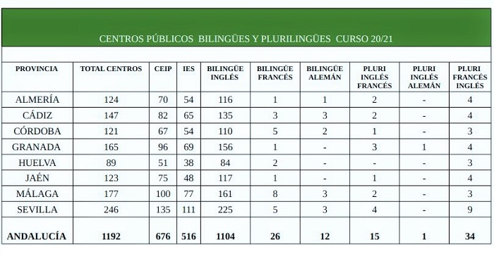 El próximo curso 2020/21 un total de 1.192 centros docentes públicos impartirán enseñanza bilingüe en Andalucía, lo que supone un incremento de 31 respecto a este curso. En concreto, se incorporarán 20 colegios de Infantil y Primaria, dos centros públicos rurales y nueve institutos de Educación Secundaria que impartirán enseñanzas bilingües español-inglés. Además, cuatro centros, uno de Primaria y tres de Secundaria amplían la enseñanza bilingüe a plurilingüe.