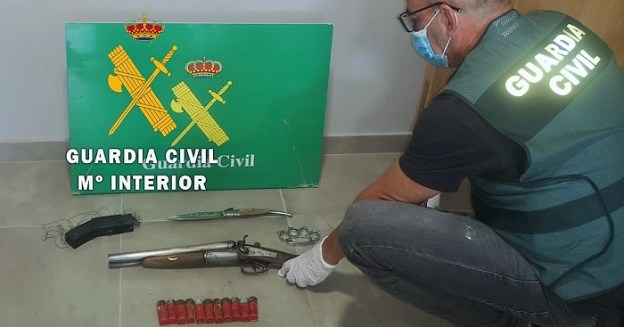 El registro exhaustivo que realizó la Guardia Civil en las dos viviendas dio como resultado el hallazgo en una de ellas, en un hueco oculto tras la nevera de la cocina, de una escopeta de calibre 12 con los cañones y culata recortados. Escondidos en el mismo lugar había un arma eléctrica tipo Taser y munición de escopeta. Durante el registro también se encontró una navaja de grandes dimensiones y una llave de pugilato considerada arma prohibida en el actual Reglamento de Armas.