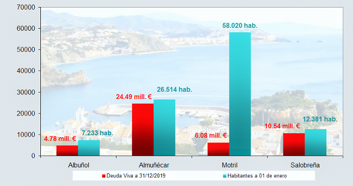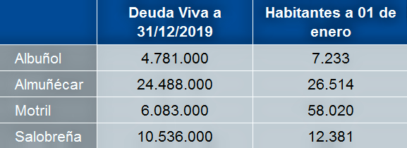En la siguiente tabla se recoge la deuda viva a 31 de diciembre de 2019 y los habitantes a 1 de enero de los municipios de Motril, Almuñécar, Salobreña y Albuñol. (Fuente: INE)