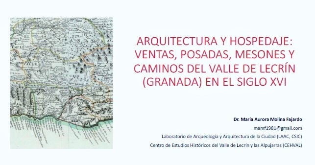 María Aurora Molina Fajardo ha presentado una comunicación con el título “Arquitectura y hospedaje: ventas, posadas, mesones y caminos del Valle de Lecrín (Granada) en el siglo XVI”. A través del análisis de los principales caminos reales que discurrieron por la comarca del Valle de Lecrín durante el siglo XVI, ha ubicado y estudiando las hospederías que en sus inmediaciones se asentaron y prestaron servicio en el Quinientos.