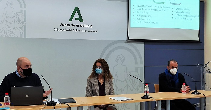 La delegada territorial de Educación y Deporte, Ana Berrocal, y los coordinadores de Transformación Digital Educativa (TDE) del CEIP Jiménez Rueda de Atarfe, Juan Alcaide, y del IES Gregorio Salvador de Cúllar, Pedro J. Ramón, han presentado en rueda de prensa las experiencias de estos dos centros educativos que están utilizando algunas de herramientas en la nube de Google y Microsoft como servicios educativos para uso del profesorado y del alumnado. Estas experiencias se ven reforzadas por el acuerdo recientemente firmado con ambas compañías por el consejero de Educación y Deporte, Javier Imbroda, para facilitar a los centros docentes públicos un buffet de servicios y aplicaciones que incluye un plan de formación.