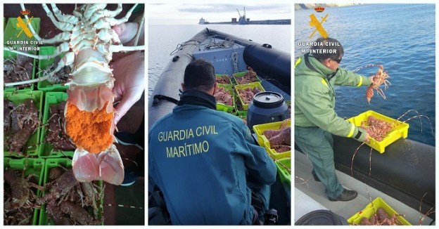 Los agentes del Servicio Marítimo Provincial de la Guardia Civil de Granada descubrieron a varios pescadores descargando langosta con huevas en las instalaciones del puerto.