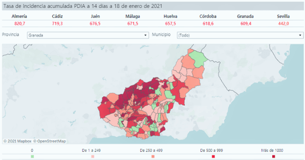 Por otra parte, los municipios de Granada que superan los 1.000 casos de Incidencia Acumulada por cada 100.000 habitantes son los siguientes: Búsquitar, Polopos y Turón (Área de Gestión Sanitaria Sur de Granada); Gorafe, Morelábor y Pedro Martínez (Área de Gestión Sanitaria Nordeste de Granada) y Alfacar, Campotéjar, Colomera, Guadahortuna, Íllora, Iznalloz, Láchar, Nívar, Pinos Puente y Píñar (Distrito Sanitaria Granada Metropolitano).