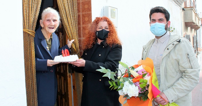 Vecina de toda la vida de Lobres, Antonia Márquez cumple hoy 100 años y lo ha hecho arropada por las felicitaciones de sus familiares. El Ayuntamiento de Salobreña también ha querido rendirle homenaje en esta fecha tan especial por lo que la alcaldesa de la Villa, María Eugenia Rufino, acompañada del concejal delegado del anejo, Nelson Ligero, ha acudido a su domicilio para entregarle un ramo de flores y una tarta en nombre de todo el pueblo.