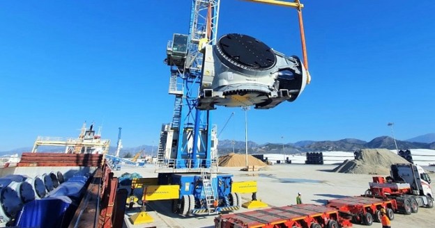 En total han sido 18 elementos que al ensamblarse forman los nueve equipos descargados y que han viajado a bordo del buque Anke, precedente de Portugal. Para su posicionamiento en el muelle ha sido necesario utilizar transporte especial al tratarse de piezas que llegan a alcanzar las 68 toneladas de peso. La idea es que sean exportados antes de verano, junto a las palas que se necesiten para montar los molinos eólicos en el destino.