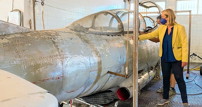 Se trata de “un hito histórico”, como ha destacado el comandante jefe del EVA 9, Rando Guirado, durante su intervención, ya que el avión no bajaba de su peana desde los años 90. “Reconocer el esfuerzo tan importante que se está haciendo para recuperar esta joya de la aviación española por parte del Ayuntamiento”, agradecía Guirado, quien ha destacado la importancia de volver a poner en valor y recuperar la vistosidad del avión Saeta.