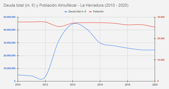 A fecha 31 de diciembre de 2011, recién llegada Herrera a la Alcaldía, la deuda viva era de 4.177.000 euros. A 31 de diciembre de 2019 Almuñécar tenía una deuda viva de 24.488.000 euros. Los 10 años de la Sra. Herrera han supuesto un “INCREMENTO DE LA DEUDA MUNICIPAL EN MÁS DE VEINTE MILLONES DE EUROS”. Es más, según Hacienda, en el año 2011 Almuñécar tenía una deuda por habitante de 150 euros que ha pasado a ser de 923 euros a 31 de diciembre de 2019.