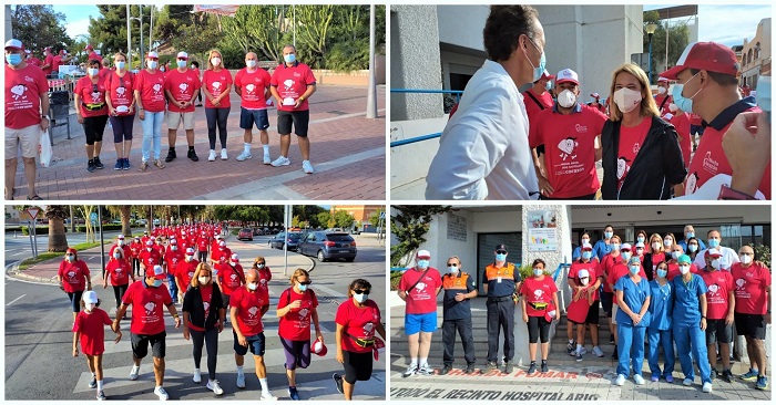 La convocatoria de la asociación Mucho Corazón, Pacientes Cardiacos Sur de Granada, no se quedó corta sino al contrario. Una serpiente monocolor rojo surcó la ciudad de sur a norte y de norte a sur, en la jornada conmemorativa del Día Internacional del Corazón (29 septiembre) que se adelantó en Motril a este pasado domingo, y que tuvo una parada emotiva y de impresionante carga humana, frente al hospital de Motril, para rendir homenaje al cardiólogo Díaz Castellanos, cuya memoria ha dado nombre a esta I marcha que ya es su memorial. Sería allí donde se escuchó un potente aplauso de todos los participantes, familias enteras y no pocos pacientes “que hoy ejemplifican, con su recuperación, la superación humana y la necesidad que tienen de trasladar sus vivencias a los demás, de promover hábitos sanos y de abrazar la vida”, declaró la alcaldesa Luisa María García Chamorro, quien participó en la totalidad de la marcha al igual que gran parte del Gobierno Municipal, en una mañana luminosa en la que los participantes tuvieron camiseta, gorra y bolsa de avituallamiento para completar un recorrido diáfano y cómodo, escoltado en todo momento por la Policía Local y Protección Civil.