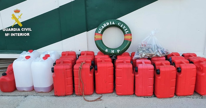 Después, al rgistar más minuciosamente la embarcación interceptada, la Guardia Civil comprobó que los 16 bidones de combustible que transportaban habían sido manipulados y que ocultaban en su interior 350 kilos en tabletas de hachís. Los guardias civiles también encontraron una mochila en el interior de la embarcación con otros 3 kilos de hachís.