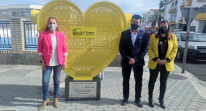 Un ‘Corazón Solidario’ ha llegado a Salobreña para quedarse y ayudar a recaudar fondos para niños con necesidades especiales a la vez que se cuida el medio ambiente. Así lo ha descrito la concejal de Bienestar Social, María José Sánchez, quien, junto con la alcaldesa de la Villa, María Eugenia Rufino, ha presentado este corazón amarillo para la recogida de tapones de plástico.