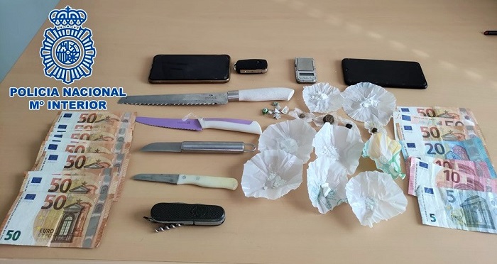 Por su parte, al segundo de los detenidos, un varón de 25 años con antecedentes policiales, se le intervinieron otras seis dosis de cocaína, 500 euros en metálico, tres cuchillos de cocina y un teléfono móvil. El vehículo de alta gama en el que circulaban también fue intervenido.