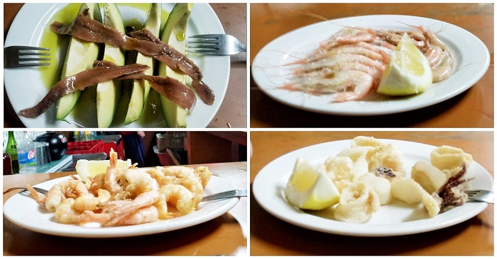 Pescado y marisco fresco: boquerones, bacalaillas, gambas, sepia o pulpo, y lo que en cada momento se tercie, a la plancha o como fritura, son preparados por Ángela y servidos por Fernando como tapas para acompañar las bebidas de los clientes. Mención especial merecen los quintos de cerveza que bien fríos son consumidos en cantidad en este singular lugar.