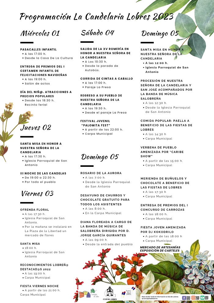 El sábado 4 es el día de la XV Romería de La Candelaria, con salida a las 10.30 horas desde la parada del autobús. Una vez en el paraje de La Presa habrá carreras de cintas a caballo y otras actividades. Por la noche habrá Festival Juvenil con “Palomita Fest”, a partir de las 22.00 h. en la carpa municipal.