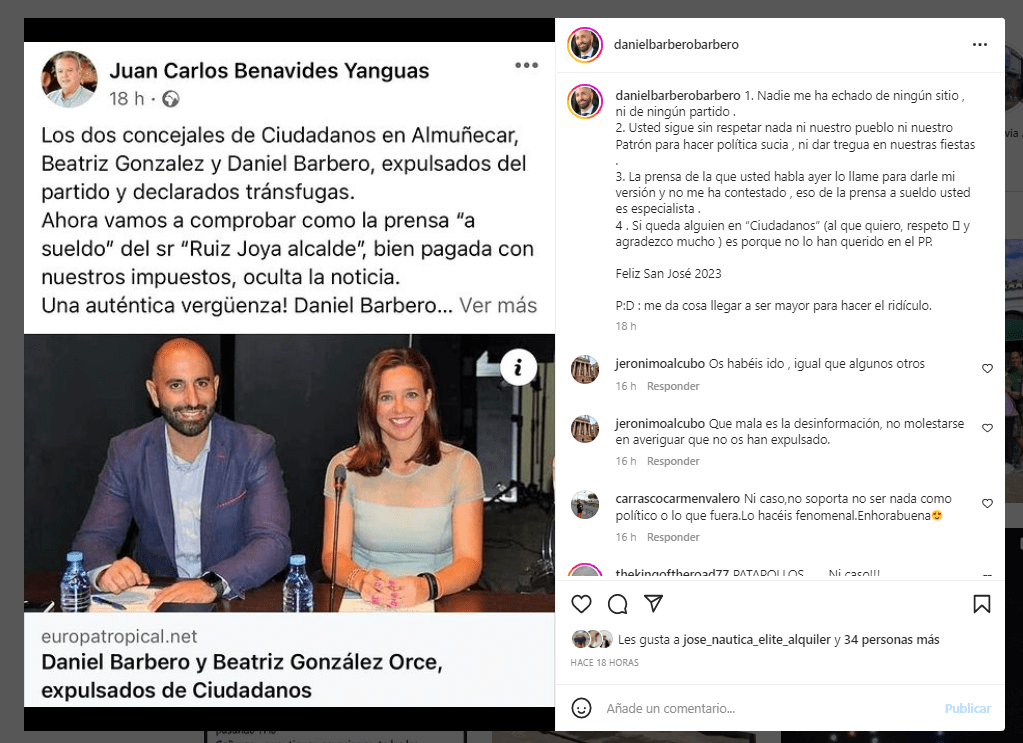 Al respecto de todo lo anterior, Daniel Barbero, ex concejal de Ciudadanos y teniente de alcalde de La Herradura y concejal delegado de Turismo y Playas, publica en su cuenta de Instagram lo siguiente: